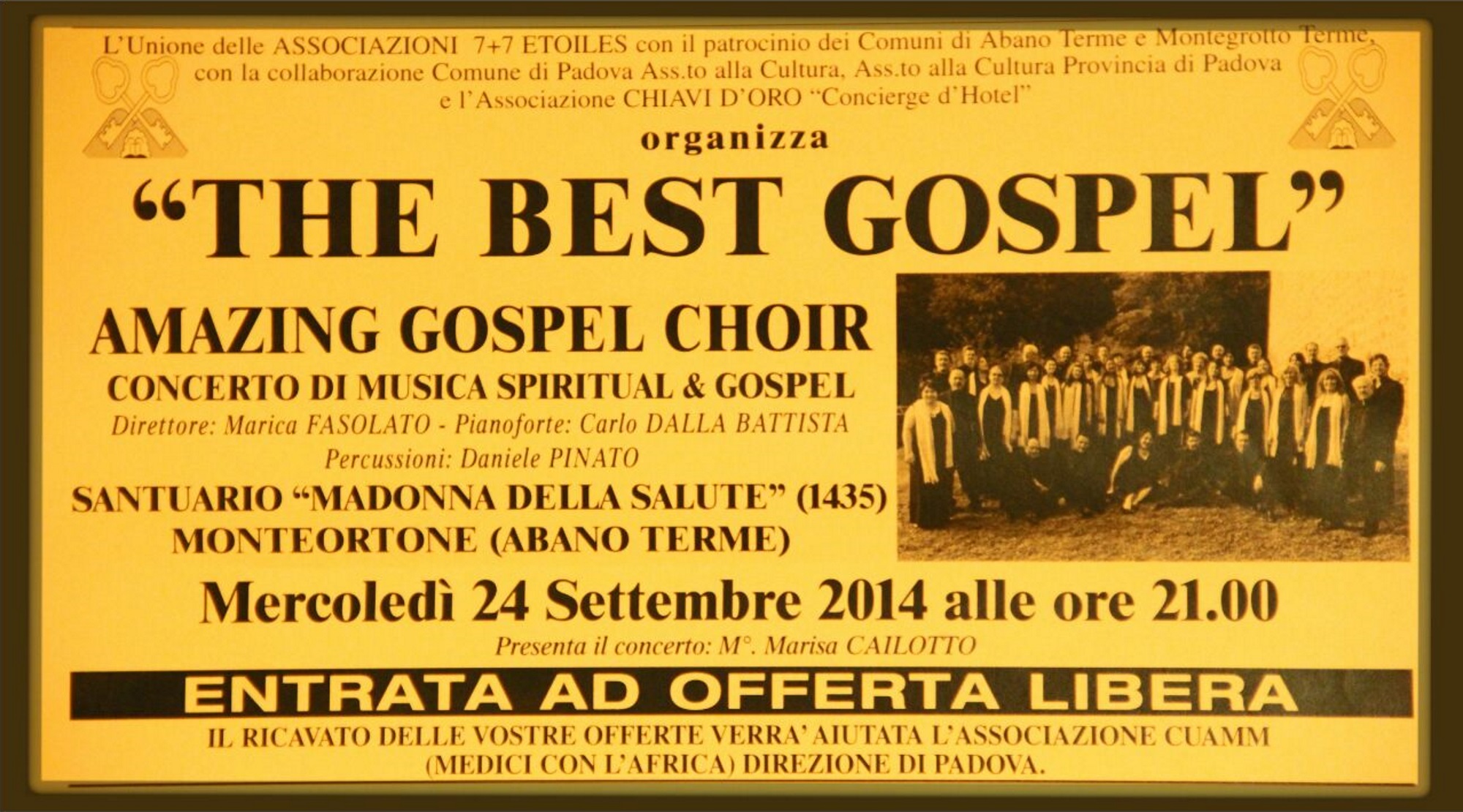 E dopo un sabato sera da fuochi d’artificio con la grandiosa esperienza in Milano con L’Italian Gospel Choir, torniamo sulla terra e ci mettiamo tutto del nostro con un classico: concerto The Best Gospel a Monteortone, presso il Santuario, per gli amici delle 14 associazioni di beneficenza aponensi, 7+7 Etoiles.