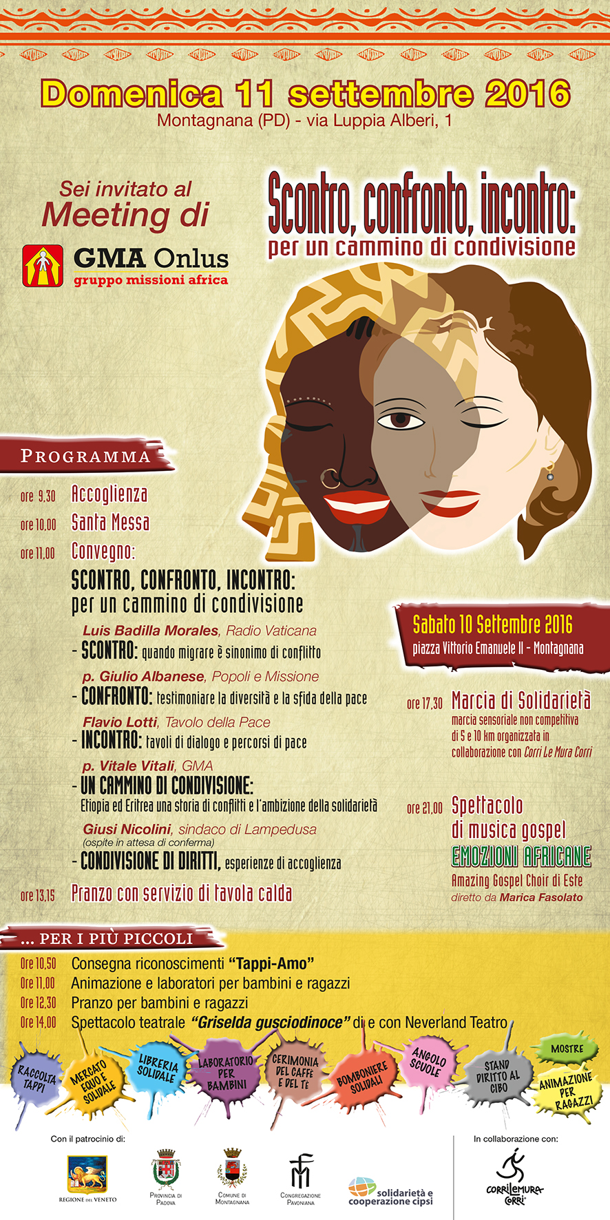 La raccomandazione è di partecipare attivamente a tutto lo splendido programma organizzato dal Gruppo Missioni Africa (GMA) Onlus, che a partire dalla marcia del sabato pomeriggio (non competitiva – ore 17.30 sempre in piazza) e per tutta la domenica gestirà una serie di bellissime iniziative tutte rivolte alla solidarietà.
