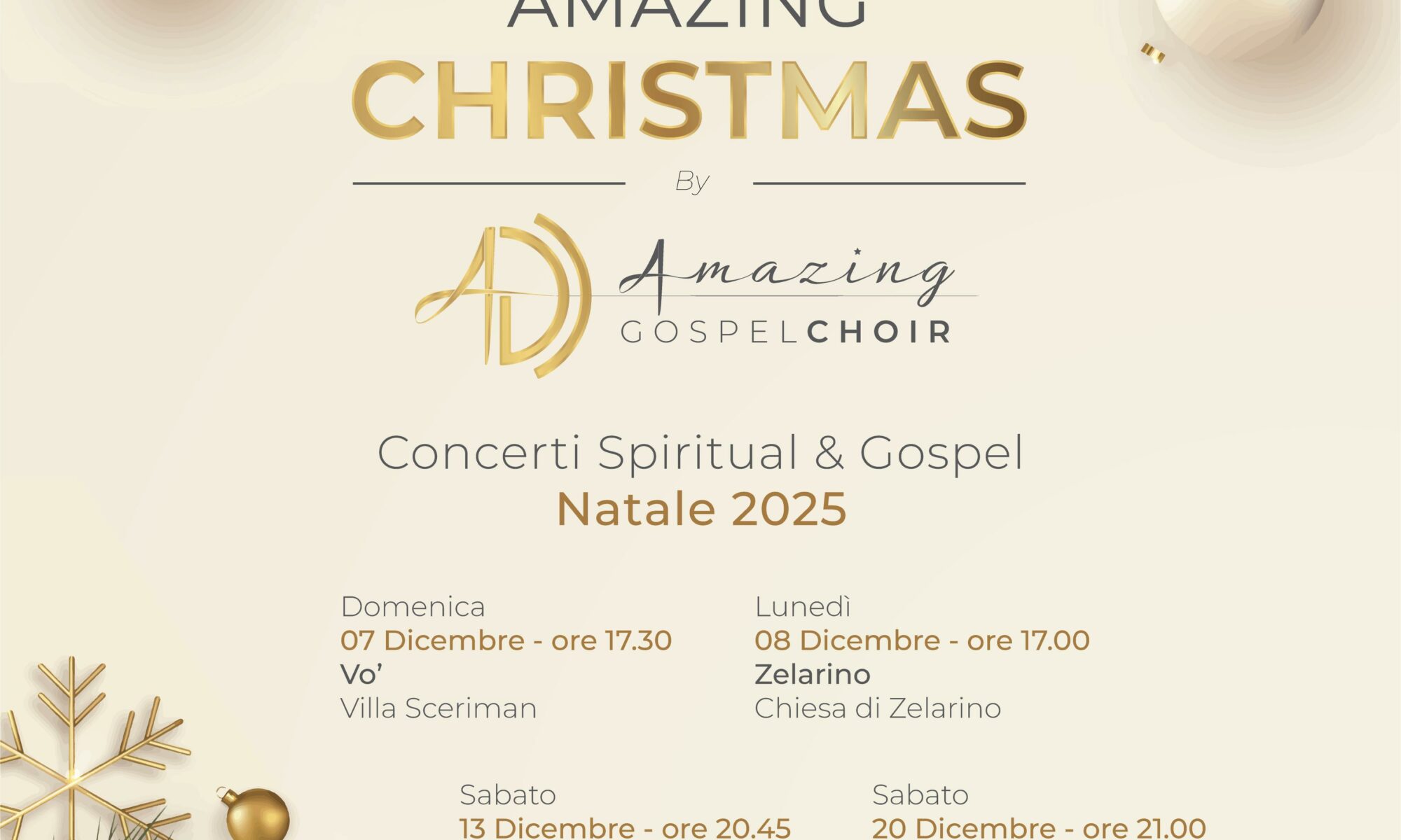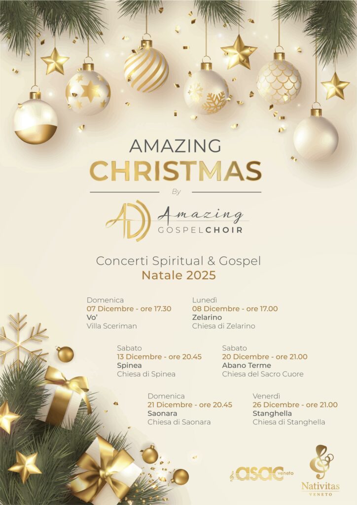 Pubblicato il 27 Novembre 202527 Novembre 2025 di adminAmazing Christmas – dicembre 2025 Anche quest’anno vi accoglieremo in numerose località, da Rovigo a Venezia, per tutto il mese di dicembre, per allietare le vostre serate e pomeriggi in attesa del Natale. Seguite i nostri appuntamenti! Aaaaamen!